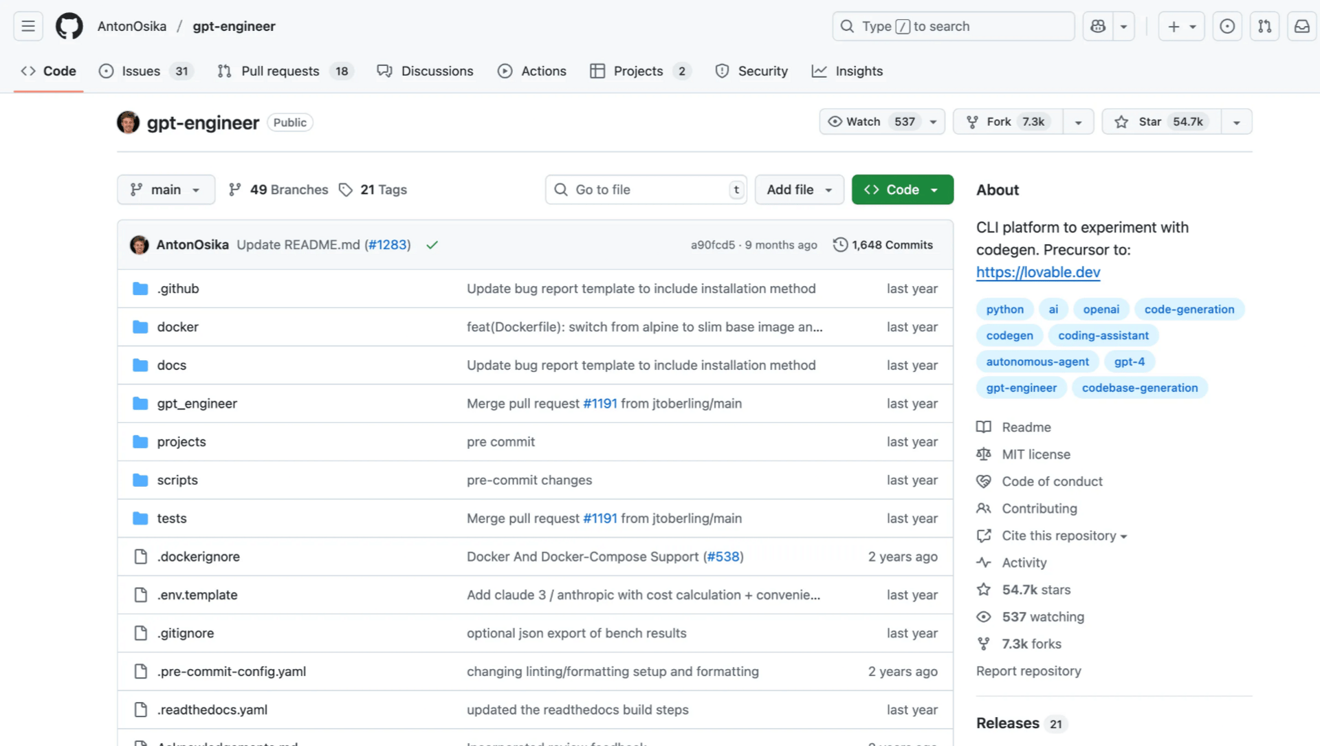 Lovable grew out of GPT-Engineer, an open-source project that reached 50,000+ GitHub stars in mid-2024.